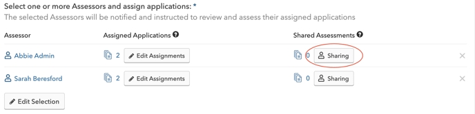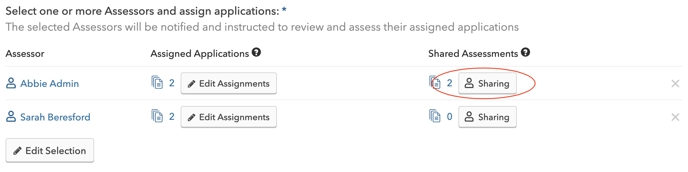 - Sharing Assessments: Click the Sharing button on an Assessor's row to share assessments from current or previous Assessment Rounds with that Assessor. Select Assessments in the popup and click Add. The Shared Assessments count will update.