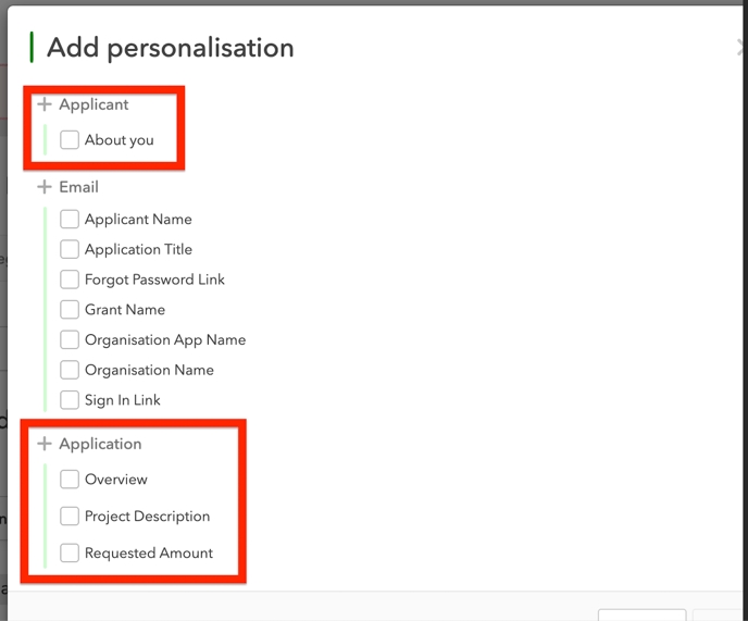 Once this is done the Tag value will become available as a Personalisation within the Email Builder Personalisation menu under the Applicant and Application sections respectively.