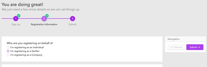 Much like Applicants, Verifiers need to complete a registration profile when they sign up so you can capture information about each Verifier organisation.
