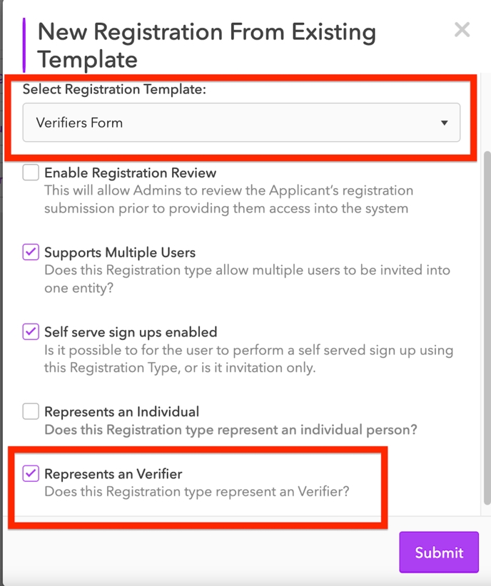 Select Use Existing Template, then choose the Registration Template you created in the previous step. Additionally, select the “Represents Verifiers” checkbox.