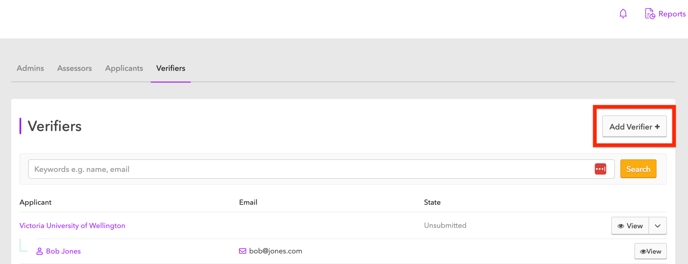 The Verifiers section is similar to the Applicants screen, offering the same abilities to view, add, and search for assigned Applications.