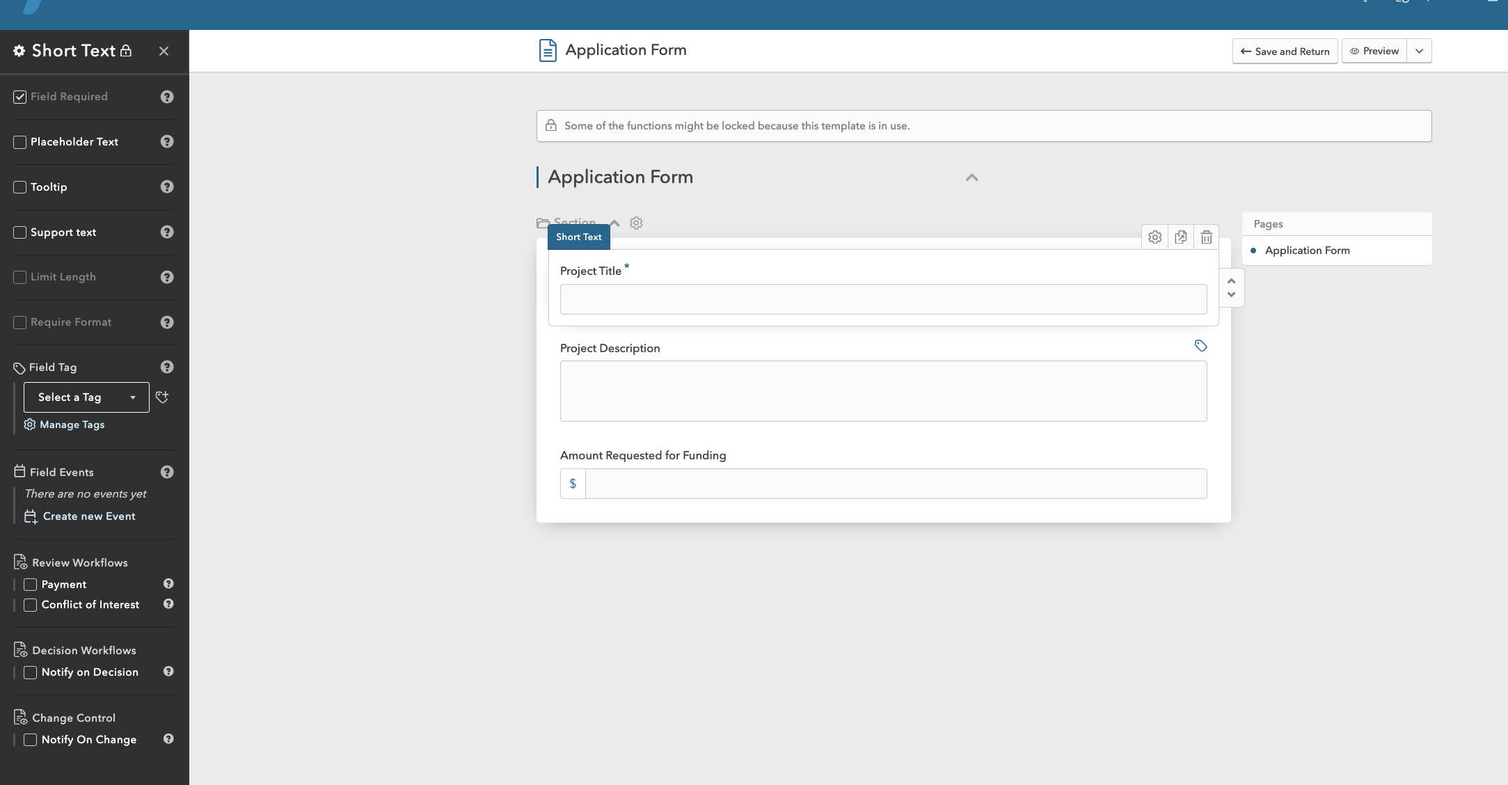 When an application template is used in a funding application it is locked